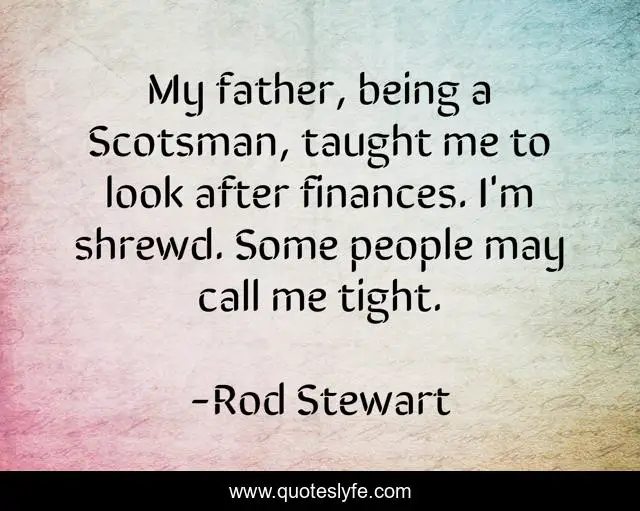 This page presents the quote "My father, being a Scotsman, taught me to look after finances. I'm shrewd. Some people may call me tight.". Author of this quote is Rod Stewart. This quote is about me, father, people,.