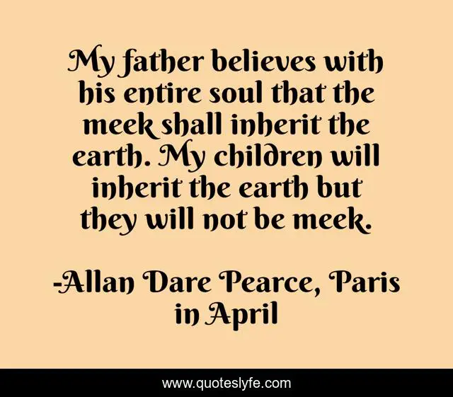 This page presents the quote "My father believes with his entire soul that the meek shall inherit the earth. My children will inherit the earth but they will not be meek.". Author of this quote is Allan Dare Pearce, Paris in April. This quote is about parents-and-children, children, meekness,.