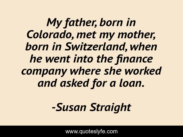 This page presents the quote "My father, born in Colorado, met my mother, born in Switzerland, when he went into the finance company where she worked and asked for a loan.". Author of this quote is Susan Straight. This quote is about company, father, mother,.