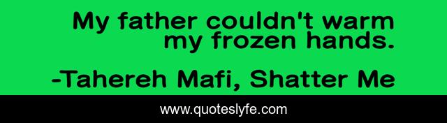 This page presents the quote "My father couldn't warm my frozen hands.". Author of this quote is Tahereh Mafi, Shatter Me. This quote is about love, fathers, hurt, tenderness, shatter-me, affection,.