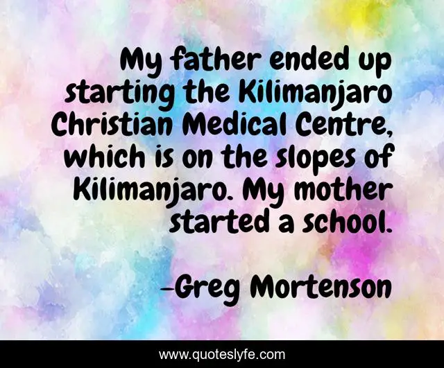 This page presents the quote "My father ended up starting the Kilimanjaro Christian Medical Centre, which is on the slopes of Kilimanjaro. My mother started a school.". Author of this quote is Greg Mortenson. This quote is about school, father, mother,.