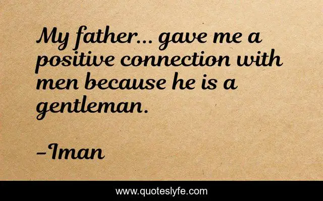 This page presents the quote "My father... gave me a positive connection with men because he is a gentleman.". Author of this quote is Iman. This quote is about me, men, father,.
