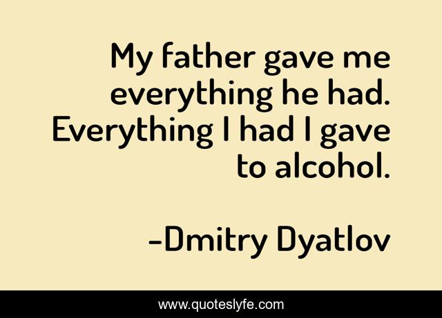 This page presents the quote "My father gave me everything he had. Everything I had I gave to alcohol.". Author of this quote is Dmitry Dyatlov. This quote is about alcoholic, alcoholism, alcohol-abuse, alcohol,.