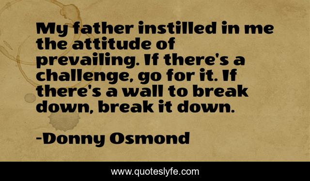 This page presents the quote "My father instilled in me the attitude of prevailing. If there's a challenge, go for it. If there's a wall to break down, break it down.". Author of this quote is Donny Osmond. This quote is about me, challenge, father,.