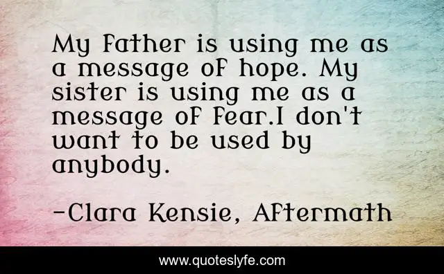 This page presents the quote "My father is using me as a message of hope. My sister is using me as a message of fear.I don't want to be used by anybody.". Author of this quote is Clara Kensie, Aftermath. This quote is about strength-of-spirit, kidnapping, recovery, family, sacrifice, clara-kensie, triumph-over-tragedy, strength, hope,.