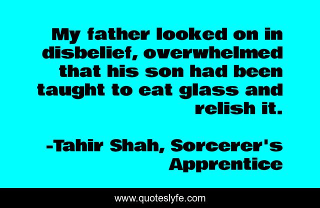This page presents the quote "My father looked on in disbelief, overwhelmed that his son had been taught to eat glass and relish it.". Author of this quote is Tahir Shah, Sorcerer's Apprentice. This quote is about illusionists, humor, illusion,.