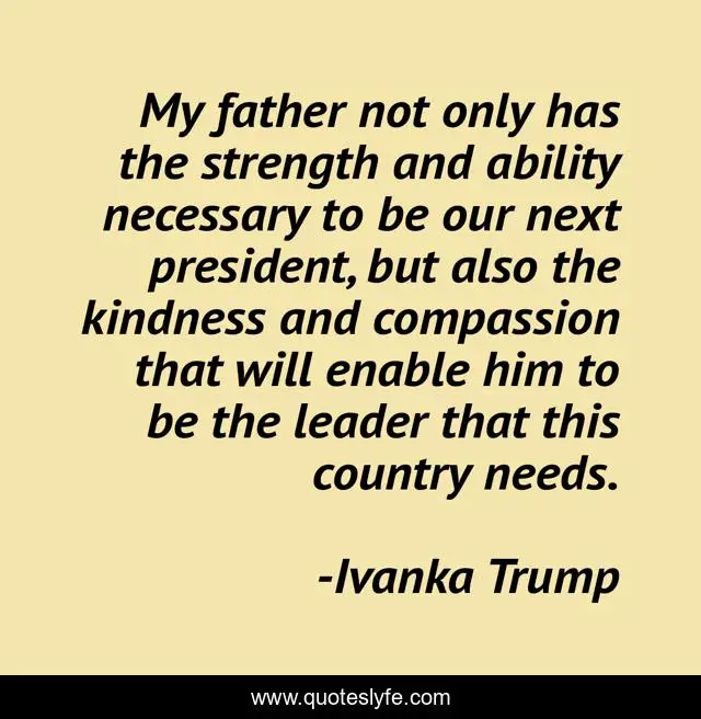 This page presents the quote "My father not only has the strength and ability necessary to be our next president, but also the kindness and compassion that will enable him to be the leader that this country needs.". Author of this quote is Ivanka Trump. This quote is about kindness, father, leader,.