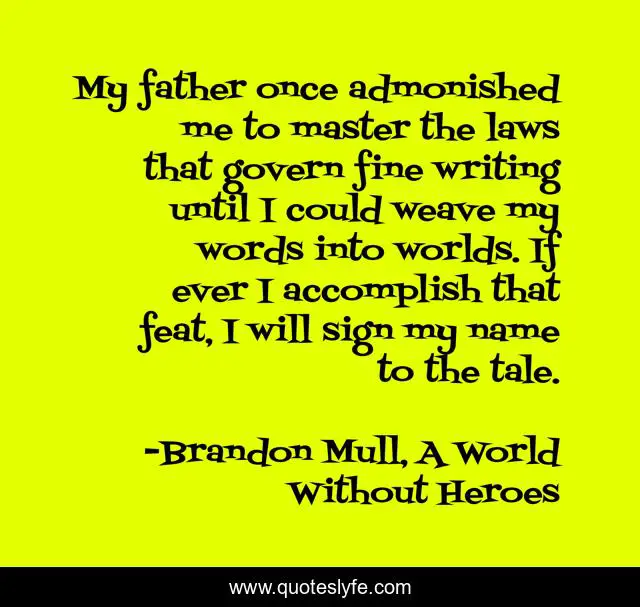 This page presents the quote "My father once admonished me to master the laws that govern fine writing until I could weave my words into worlds. If ever I accomplish that feat, I will sign my name to the tale.". Author of this quote is Brandon Mull, A World Without Heroes. This quote is about books, loremaster, writers, writing,.