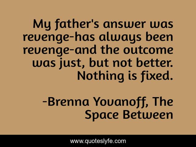 This page presents the quote "My father's answer was revenge-has always been revenge-and the outcome was just, but not better. Nothing is fixed.". Author of this quote is Brenna Yovanoff, The Space Between. This quote is about lucifer, revenge,.