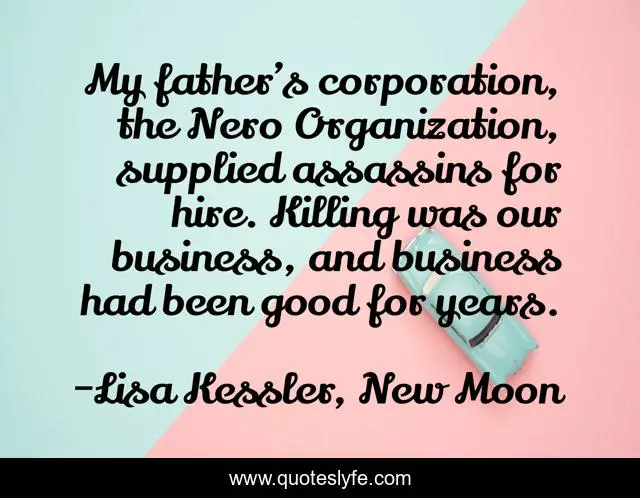 This page presents the quote "My father’s corporation, the Nero Organization, supplied assassins for hire. Killing was our business, and business had been good for years.". Author of this quote is Lisa Kessler, New Moon. This quote is about werewolves, paranormal-romance, shifter-romance,.