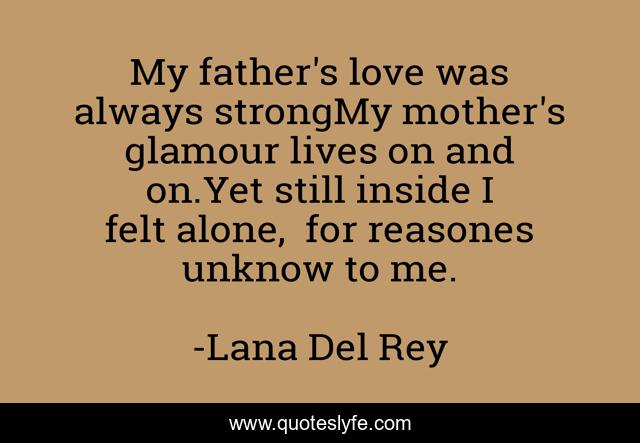 This page presents the quote "My father's love was always strongMy mother's glamour lives on and on.Yet still inside I felt alone, for reasones unknow to me.". Author of this quote is Lana Del Rey. This quote is about poem, unknow, father, lonley, poetry, lana-del-rey, mother, alone, old-money,.