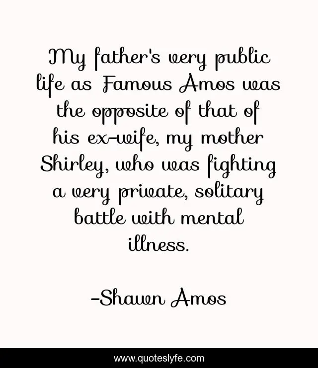 This page presents the quote "My father's very public life as Famous Amos was the opposite of that of his ex-wife, my mother Shirley, who was fighting a very private, solitary battle with mental illness.". Author of this quote is Shawn Amos. This quote is about life, father, mother,.