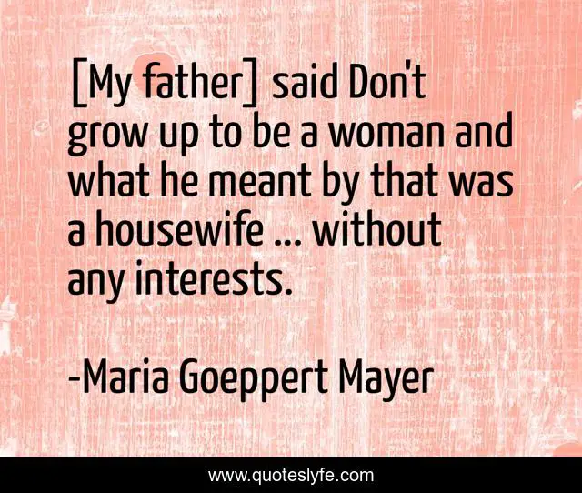 This page presents the quote "[My father] said Don't grow up to be a woman and what he meant by that was a housewife ... without any interests.". Author of this quote is Maria Goeppert Mayer. .