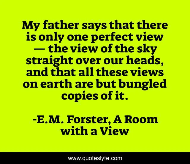 This page presents the quote "My father says that there is only one perfect view — the view of the sky straight over our heads, and that all these views on earth are but bungled copies of it.". Author of this quote is E.M. Forster, A Room with a View. This quote is about perception, beauty, the-sky, view,.