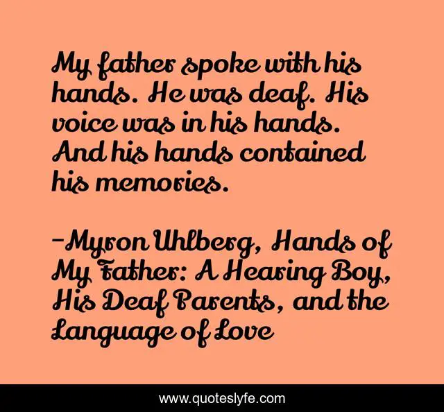 This page presents the quote "My father spoke with his hands. He was deaf. His voice was in his hands. And his hands contained his memories.". Author of this quote is Myron Uhlberg, Hands of My Father: A Hearing Boy, His Deaf Parents, and the Language of Love. This quote is about memories, deafness, father, parents,.