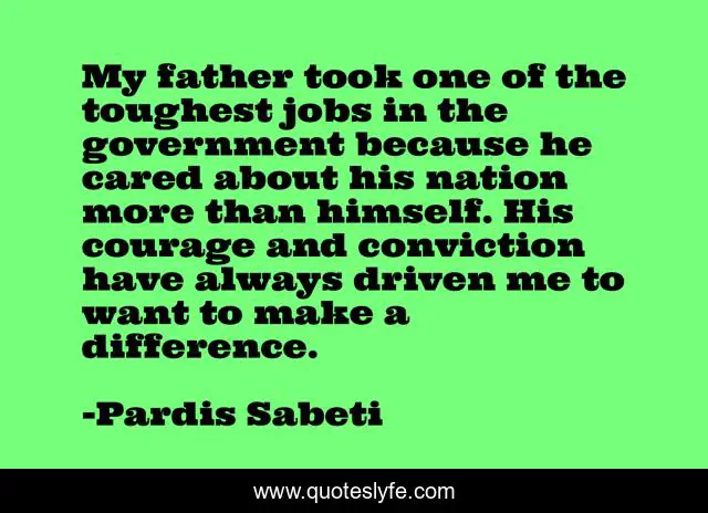 This page presents the quote "My father took one of the toughest jobs in the government because he cared about his nation more than himself. His courage and conviction have always driven me to want to make a difference.". Author of this quote is Pardis Sabeti. This quote is about me, father, government,.