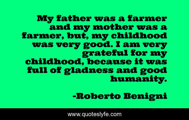 This page presents the quote "My father was a farmer and my mother was a farmer, but, my childhood was very good. I am very grateful for my childhood, because it was full of gladness and good humanity.". Author of this quote is Roberto Benigni. This quote is about good, father, mother,.