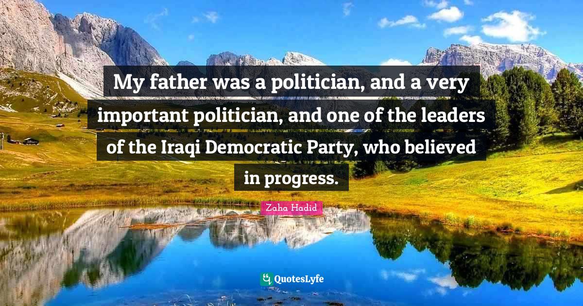 This page presents the quote "My father was a politician, and a very important politician, and one of the leaders of the Iraqi Democratic Party, who believed in progress.". Author of this quote is Zaha Hadid. This quote is about party, leader, important, politician, democratic party, father, progress,.