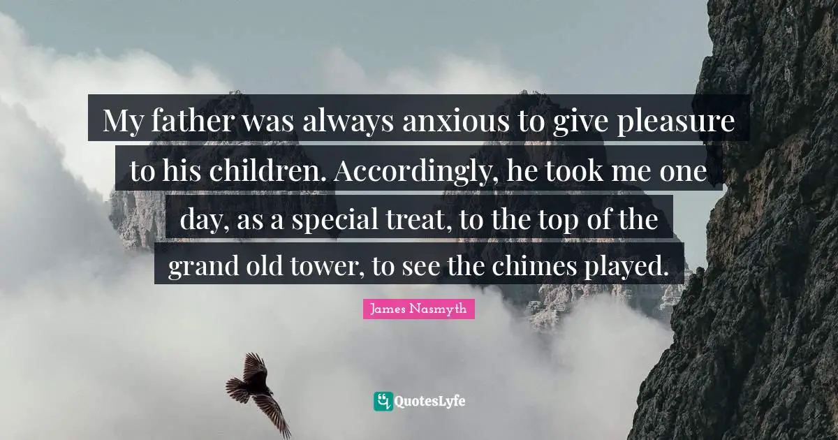 This page presents the quote "My father was always anxious to give pleasure to his children. Accordingly, he took me one day, as a special treat, to the top of the grand old tower, to see the chimes played.". Author of this quote is James Nasmyth. This quote is about pleasure, anxious, chimes, one day, special, giving, father, children,.