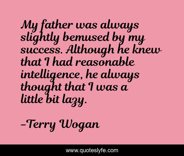 This page presents the quote "My father was always slightly bemused by my success. Although he knew that I had reasonable intelligence, he always thought that I was a little bit lazy.". Author of this quote is Terry Wogan. This quote is about thought, father, success,.