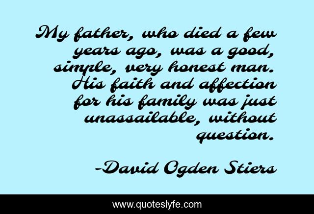 This page presents the quote "My father, who died a few years ago, was a good, simple, very honest man. His faith and affection for his family was just unassailable, without question.". Author of this quote is David Ogden Stiers. This quote is about faith, good, father,.