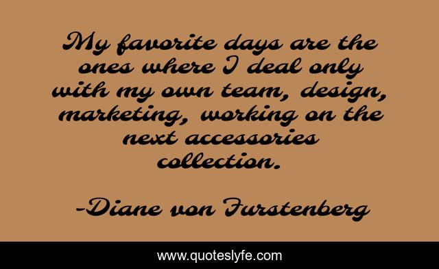This page presents the quote "My favorite days are the ones where I deal only with my own team, design, marketing, working on the next accessories collection.". Author of this quote is Diane von Furstenberg. This quote is about marketing, working, team,.