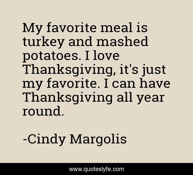 This page presents the quote "My favorite meal is turkey and mashed potatoes. I love Thanksgiving, it's just my favorite. I can have Thanksgiving all year round.". Author of this quote is Cindy Margolis. This quote is about love, favorite, i can, affection,.