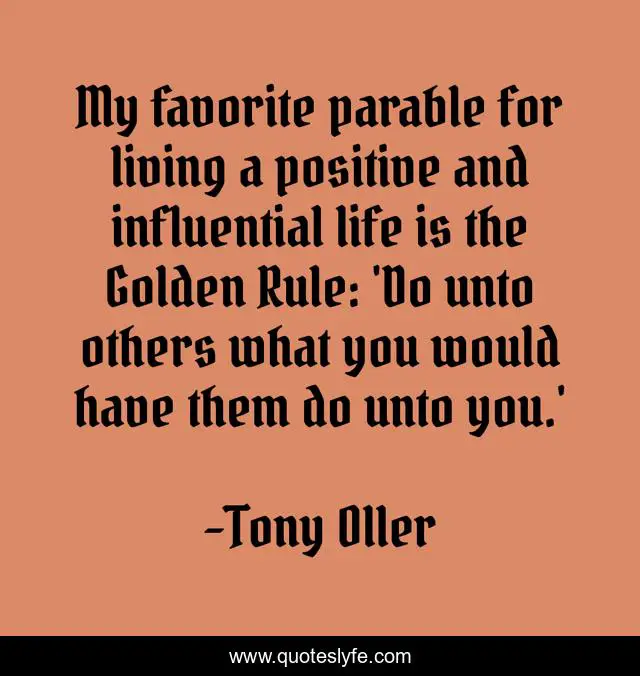 This page presents the quote "My favorite parable for living a positive and influential life is the Golden Rule: 'Do unto others what you would have them do unto you.'". Author of this quote is Tony Oller. This quote is about living, life,.