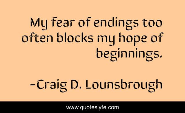 This page presents the quote "My fear of endings too often blocks my hope of beginnings.". Author of this quote is Craig D. Lounsbrough. This quote is about begin, end, hoping, beginnings, fearful, hopeful, stop, endings, start,.