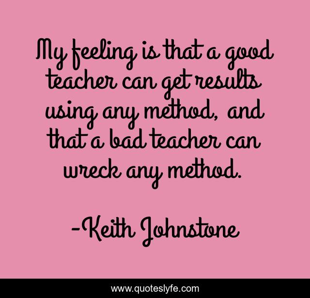 This page presents the quote "My feeling is that a good teacher can get results using any method, and that a bad teacher can wreck any method.". Author of this quote is Keith Johnstone. This quote is about teaching, methods,.