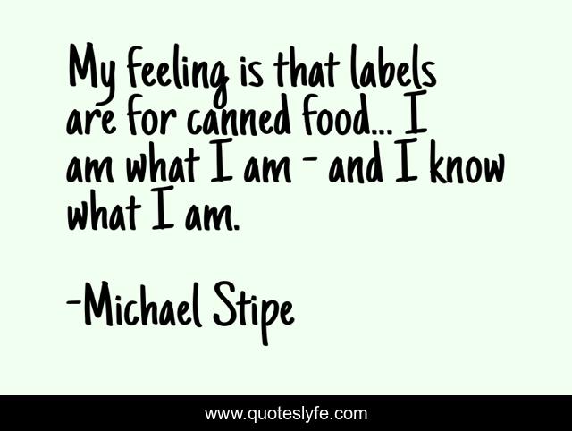 This page presents the quote "My feeling is that labels are for canned food... I am what I am - and I know what I am.". Author of this quote is Michael Stipe. .