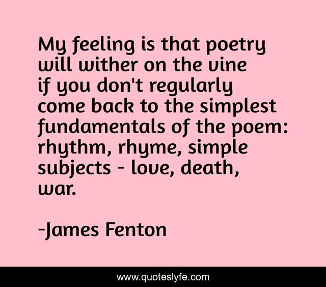 This page presents the quote "My feeling is that poetry will wither on the vine if you don't regularly come back to the simplest fundamentals of the poem: rhythm, rhyme, simple subjects - love, death, war.". Author of this quote is James Fenton. This quote is about death, love, war, affection,.