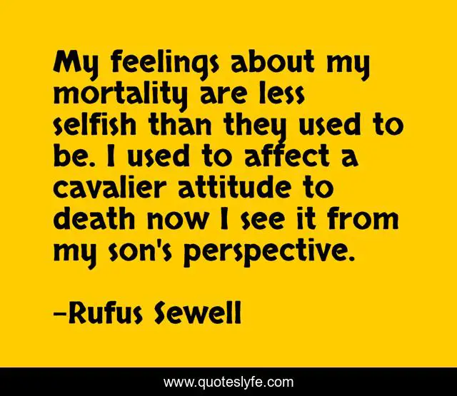 This page presents the quote "My feelings about my mortality are less selfish than they used to be. I used to affect a cavalier attitude to death now I see it from my son's perspective.". Author of this quote is Rufus Sewell. This quote is about death, perspective, son,.