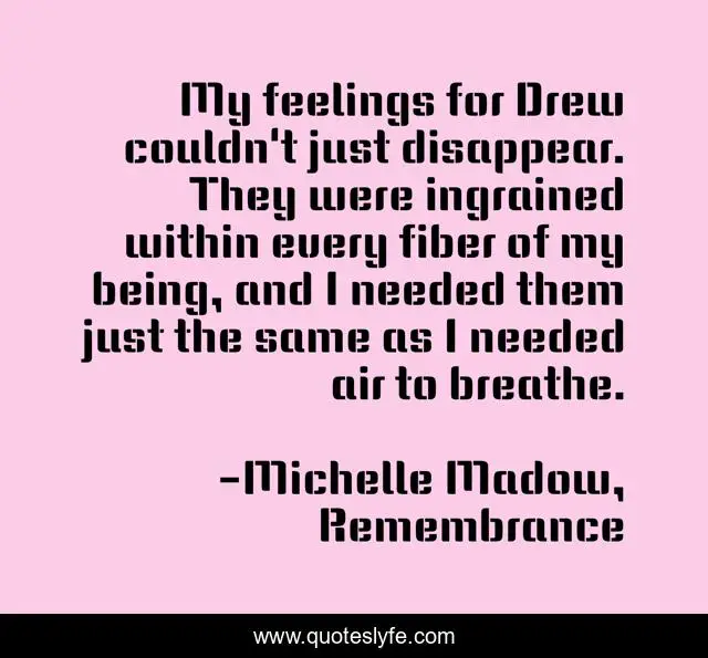 This page presents the quote "My feelings for Drew couldn't just disappear. They were ingrained within every fiber of my being, and I needed them just the same as I needed air to breathe.". Author of this quote is Michelle Madow, Remembrance. This quote is about true-love, love, love-story, affection,.