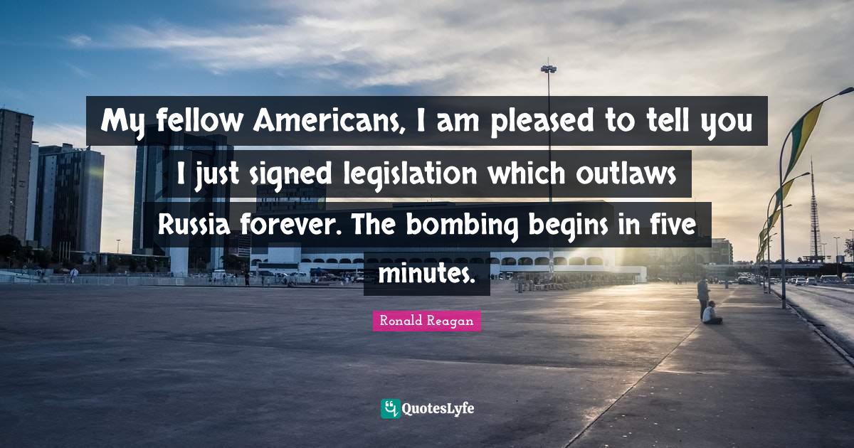 This page presents the quote "My fellow Americans, I am pleased to tell you I just signed legislation which outlaws Russia forever. The bombing begins in five minutes.". Author of this quote is Ronald Reagan. This quote is about forever, russia, legislation, funny, bombing, five minutes, humor,.