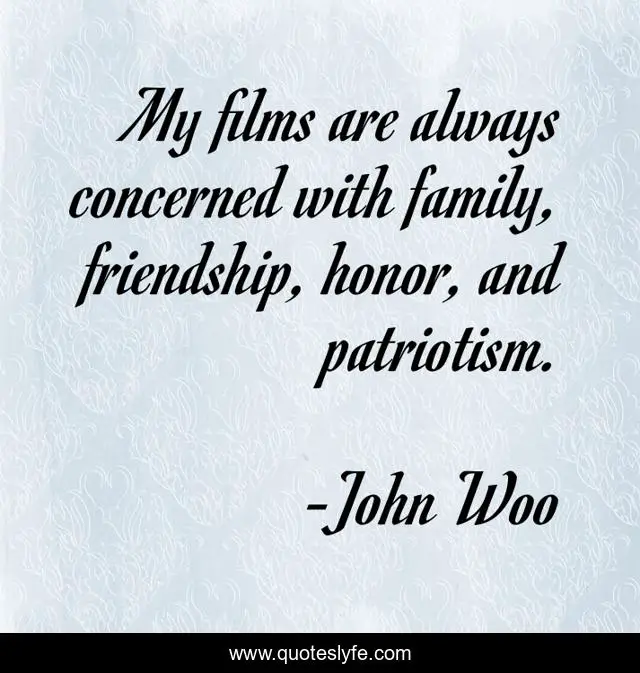 This page presents the quote "My films are always concerned with family, friendship, honor, and patriotism.". Author of this quote is John Woo. This quote is about friendship, honor, family,.