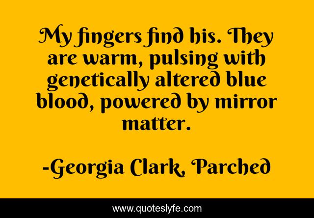 This page presents the quote "My fingers find his. They are warm, pulsing with genetically altered blue blood, powered by mirror matter.". Author of this quote is Georgia Clark, Parched. This quote is about dystopia, love, sci-fi, science-fiction, romance, affection,.