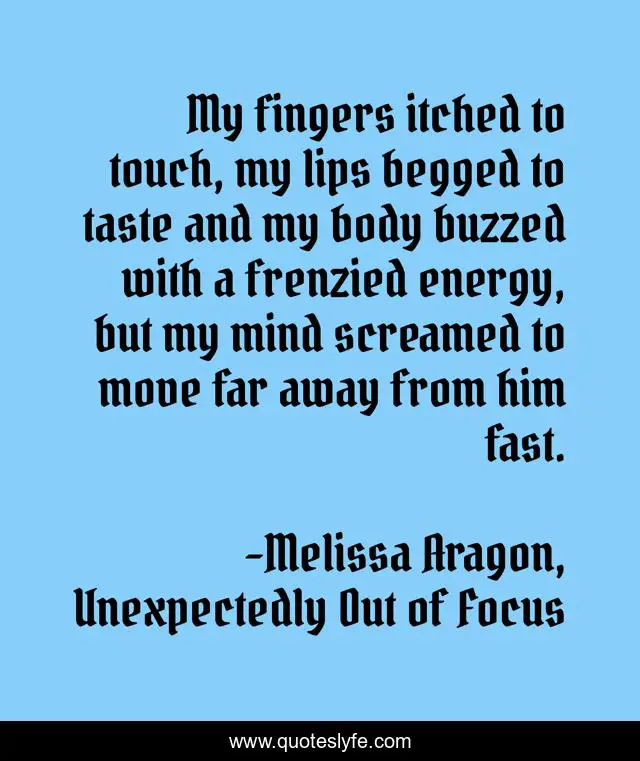 This page presents the quote "My fingers itched to touch, my lips begged to taste and my body buzzed with a frenzied energy, but my mind screamed to move far away from him fast.". Author of this quote is Melissa Aragon, Unexpectedly Out of Focus. This quote is about romance, romance-novels,.