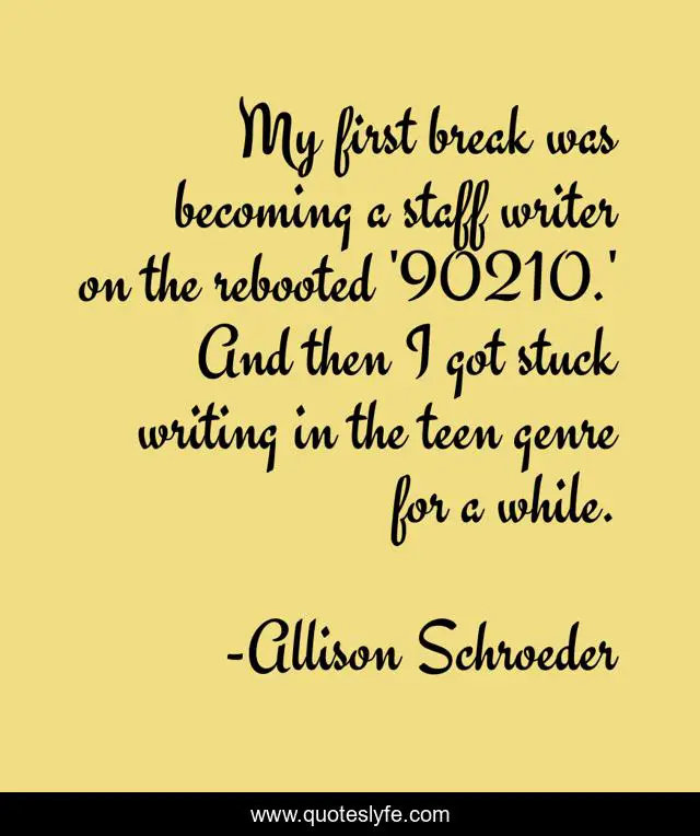 This page presents the quote "My first break was becoming a staff writer on the rebooted '90210.' And then I got stuck writing in the teen genre for a while.". Author of this quote is Allison Schroeder. This quote is about break, writing, first,.