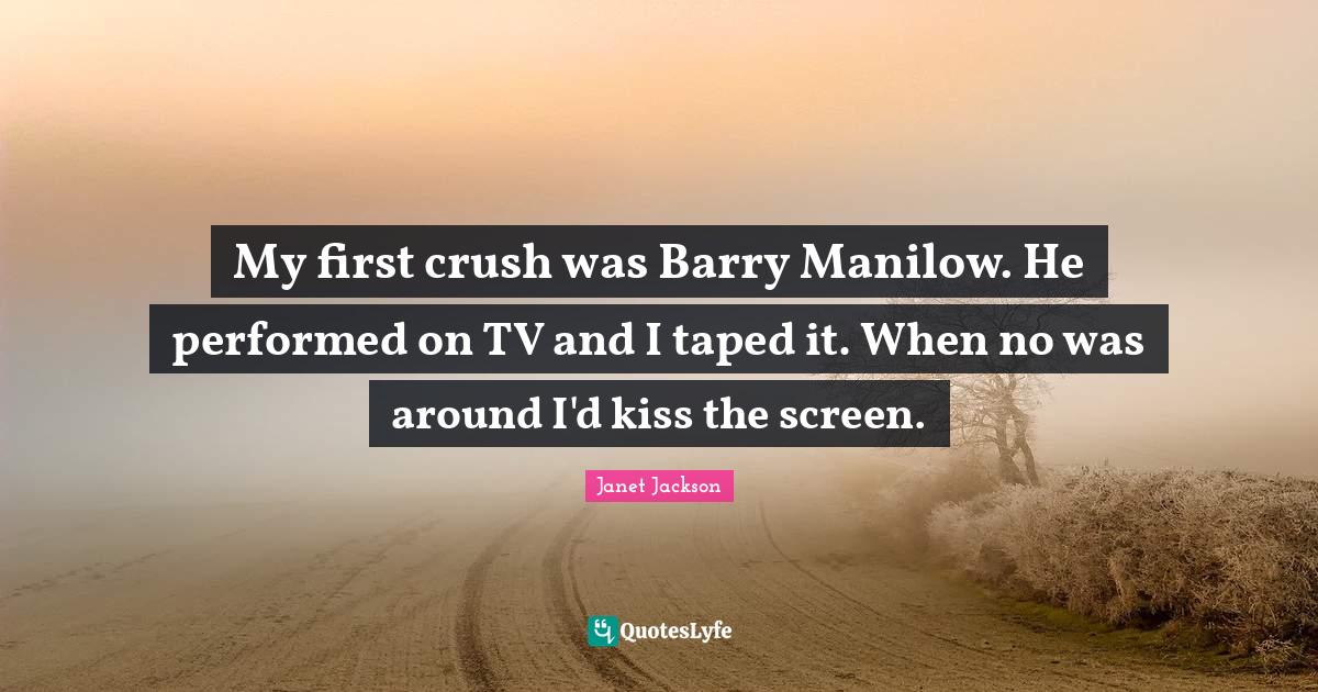 This page presents the quote "My first crush was Barry Manilow. He performed on TV and I taped it. When no was around I'd kiss the screen.". Author of this quote is Janet Jackson. This quote is about first kiss, first crush, kissing, crush,.