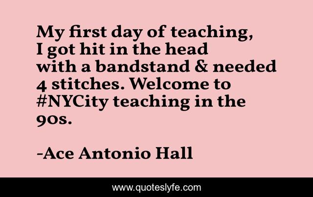 This page presents the quote "My first day of teaching, I got hit in the head with a bandstand & needed 4 stitches. Welcome to #NYCity teaching in the 90s.". Author of this quote is Ace Antonio Hall. .