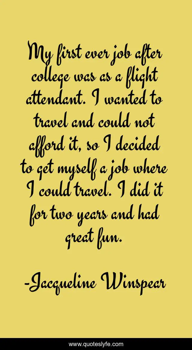 This page presents the quote "My first ever job after college was as a flight attendant. I wanted to travel and could not afford it, so I decided to get myself a job where I could travel. I did it for two years and had great fun.". Author of this quote is Jacqueline Winspear. This quote is about myself, college, great,.
