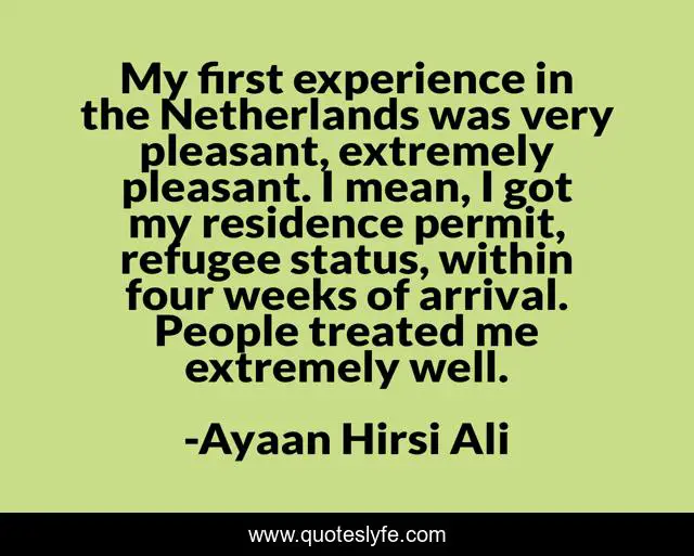 This page presents the quote "My first experience in the Netherlands was very pleasant, extremely pleasant. I mean, I got my residence permit, refugee status, within four weeks of arrival. People treated me extremely well.". Author of this quote is Ayaan Hirsi Ali. This quote is about me, people, mean,.