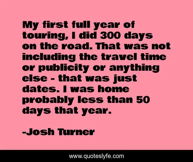 This page presents the quote "My first full year of touring, I did 300 days on the road. That was not including the travel time or publicity or anything else - that was just dates. I was home probably less than 50 days that year.". Author of this quote is Josh Turner. This quote is about home, road, time,.