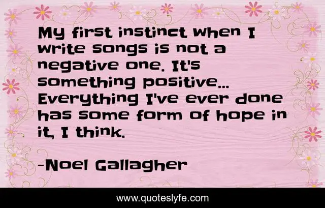 This page presents the quote "My first instinct when I write songs is not a negative one. It's something positive... Everything I've ever done has some form of hope in it, I think.". Author of this quote is Noel Gallagher. This quote is about negative, hope, think,.