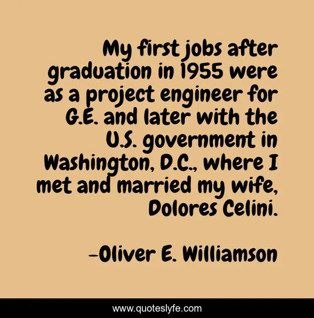 This page presents the quote "My first jobs after graduation in 1955 were as a project engineer for G.E. and later with the U.S. government in Washington, D.C., where I met and married my wife, Dolores Celini.". Author of this quote is Oliver E. Williamson. This quote is about wife, government, engineer,.