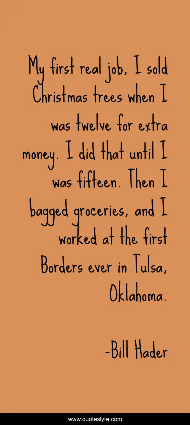 This page presents the quote "My first real job, I sold Christmas trees when I was twelve for extra money. I did that until I was fifteen. Then I bagged groceries, and I worked at the first Borders ever in Tulsa, Oklahoma.". Author of this quote is Bill Hader. This quote is about money, job, trees,.