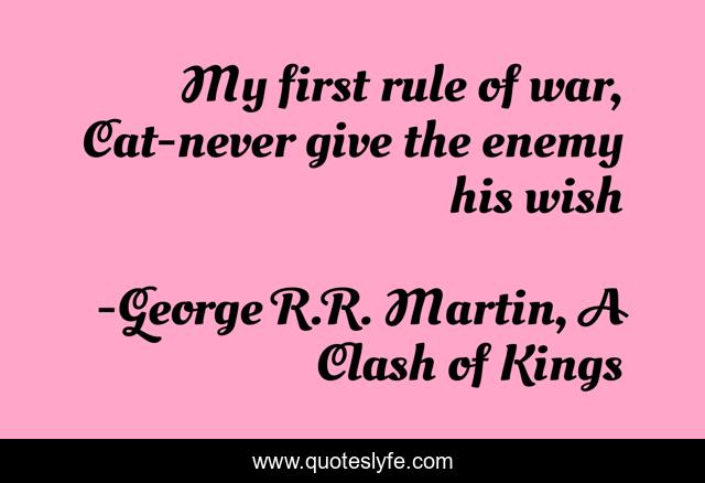 This page presents the quote "My first rule of war, Cat-never give the enemy his wish". Author of this quote is George R.R. Martin, A Clash of Kings. This quote is about enemy, tully, rules, a-clash-of-kings, bryden-blackfish, cat, wishes, war, first,.