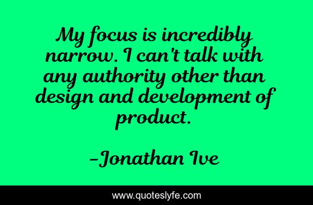 This page presents the quote "My focus is incredibly narrow. I can't talk with any authority other than design and development of product.". Author of this quote is Jonathan Ive. This quote is about development, focus,.