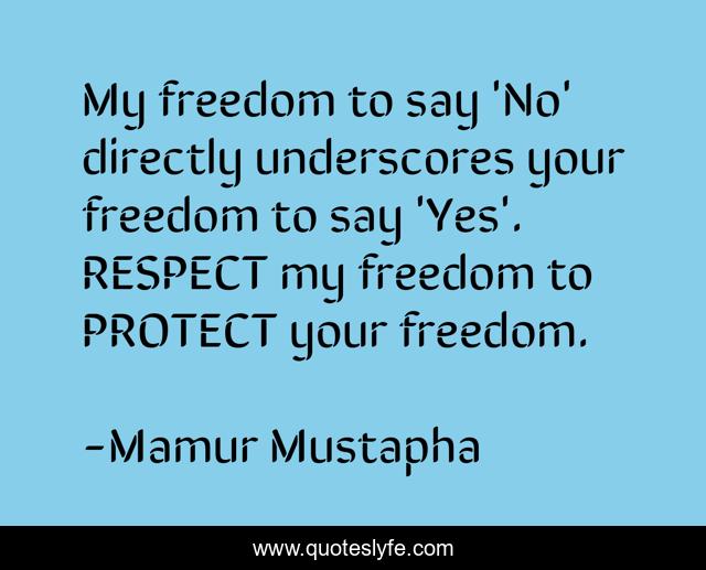 This page presents the quote "My freedom to say 'No' directly underscores your freedom to say 'Yes'. RESPECT my freedom to PROTECT your freedom.". Author of this quote is Mamur Mustapha. This quote is about freedom-of-speech, rights, freedom, liberty, individual, respect, freedom-of-expression,.